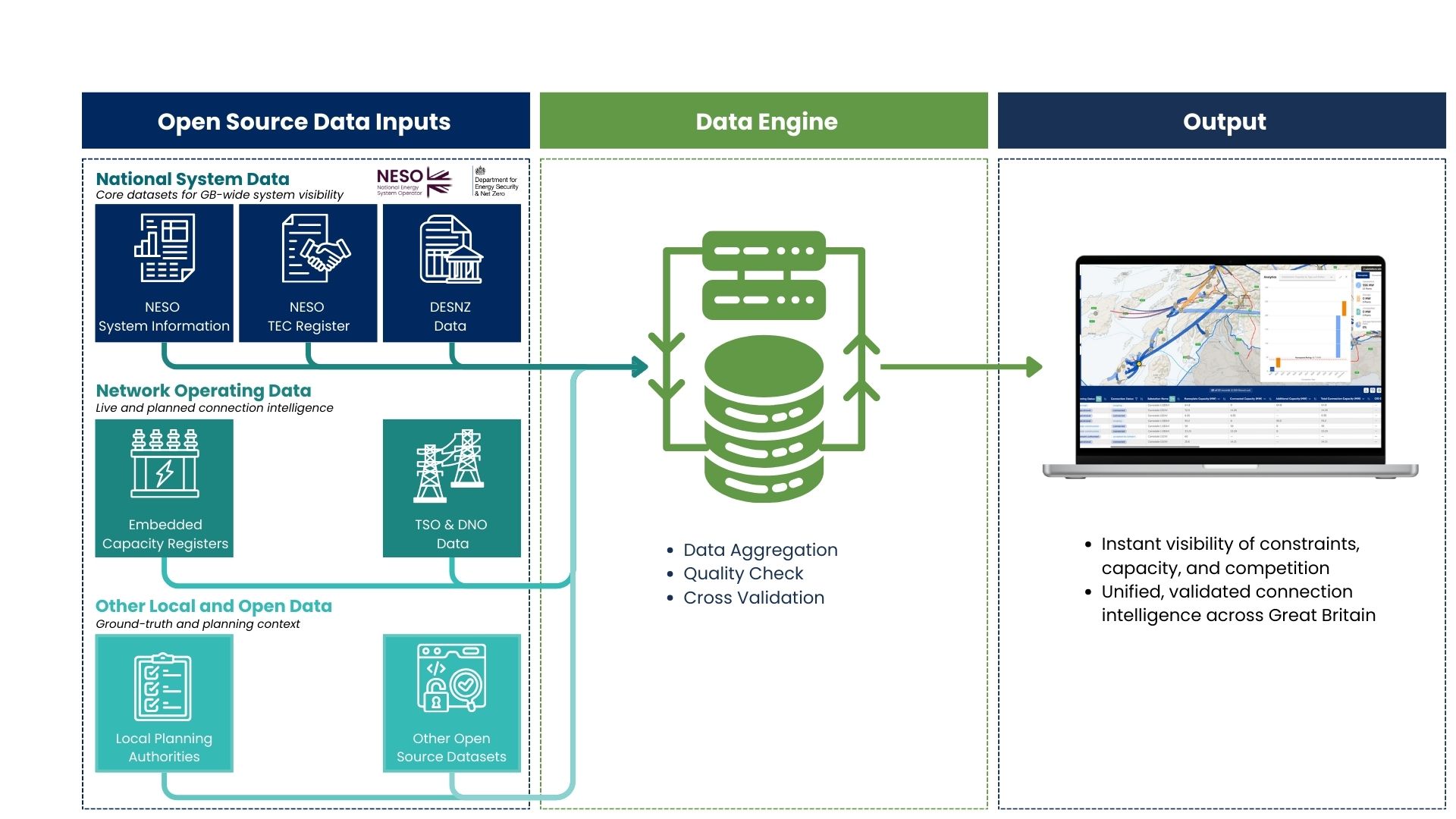 All data is subject to aggregation, quality checks, and cross-validation, providing unified, GB-wide visibility of both live and planned connections within real-world planning and environmental contexts .